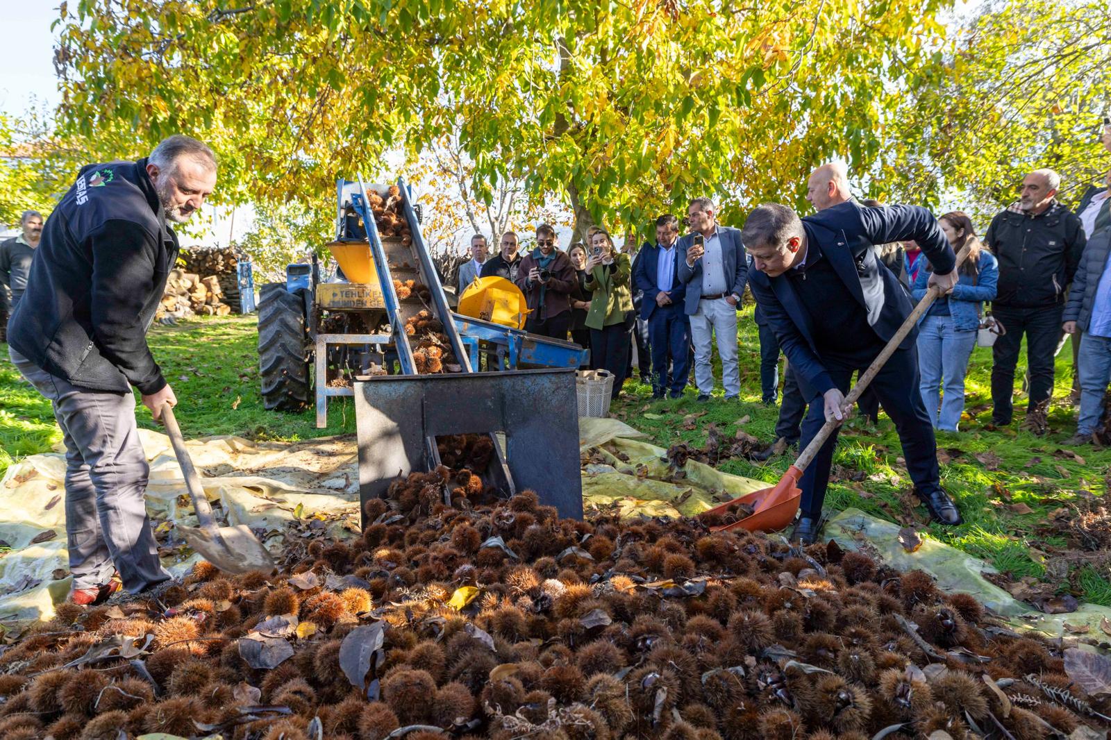 Bölgenin kestane üreticileriyle buluşmak için Beydağ’a giden İzmir Büyükşehir Belediye Başkanı Dr. Cemil Tugay, Erikli Mahallesi’nde kestane hasadına katıldı.